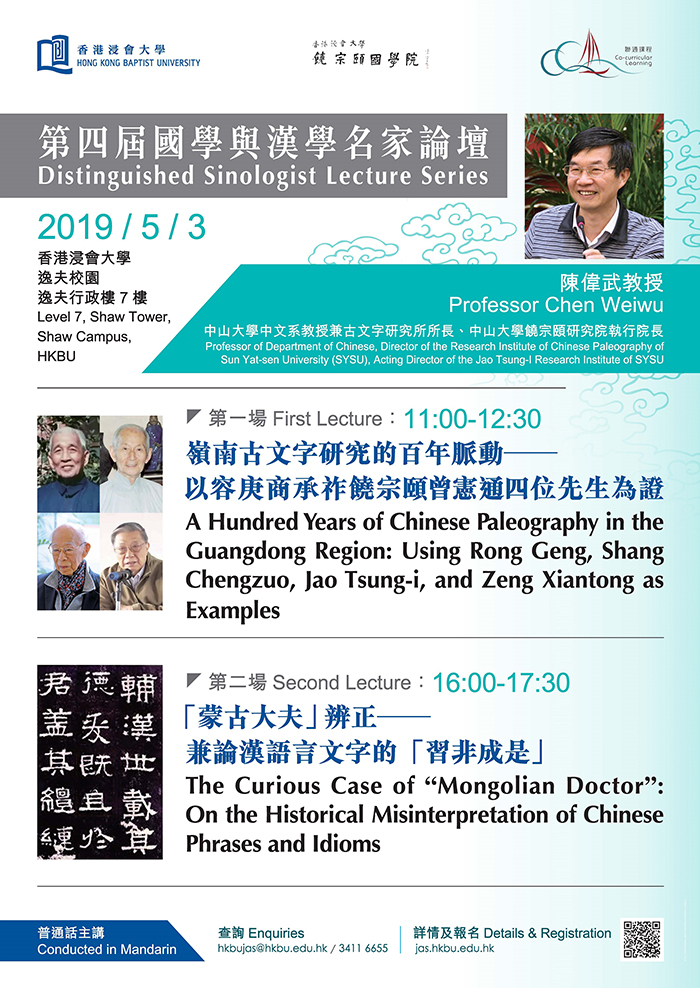 The Hong Kong Baptist University Jao Tsung-I Academy of Sinology is honoured to invite Professor CHEN Weiwu, Professor of Department of Chinese, Director of the Research Institute of Chinese Paleography of Sun Yat-sen University (SYSU), Acting Director of the Jao Tsung-I Research Institute of SYSU, to speak for Distinguished Sinologists Lecture Series. Event details are as follows: