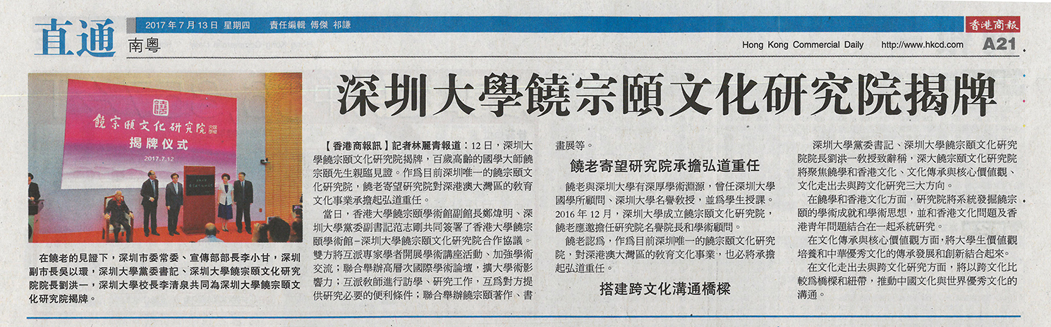 7月12日下午,深圳大學饒宗頤文化研究院揭牌儀式在深圳大學科技樓二號報告廳舉行,百歲高齡的國學大師饒宗頤先生親臨見證。中國文聯副主席潘魯生,深圳市委常委、宣傳部部長李小甘,深圳市政府副市長吳以環,深圳大學黨委書記、深圳大學饒宗頤文化研究院院長劉洪一,深圳大學校長李清泉,以及國際中國哲學學會榮譽會長、國際易經學會主席、美國夏威夷大學哲學系終身教授著名海外漢學家成中英,中國工程院院士、香港大學饒宗頤學術館館長、饒學研究基金董事會主席李焯芬等海內外專家及深大師生230餘人參加會議。